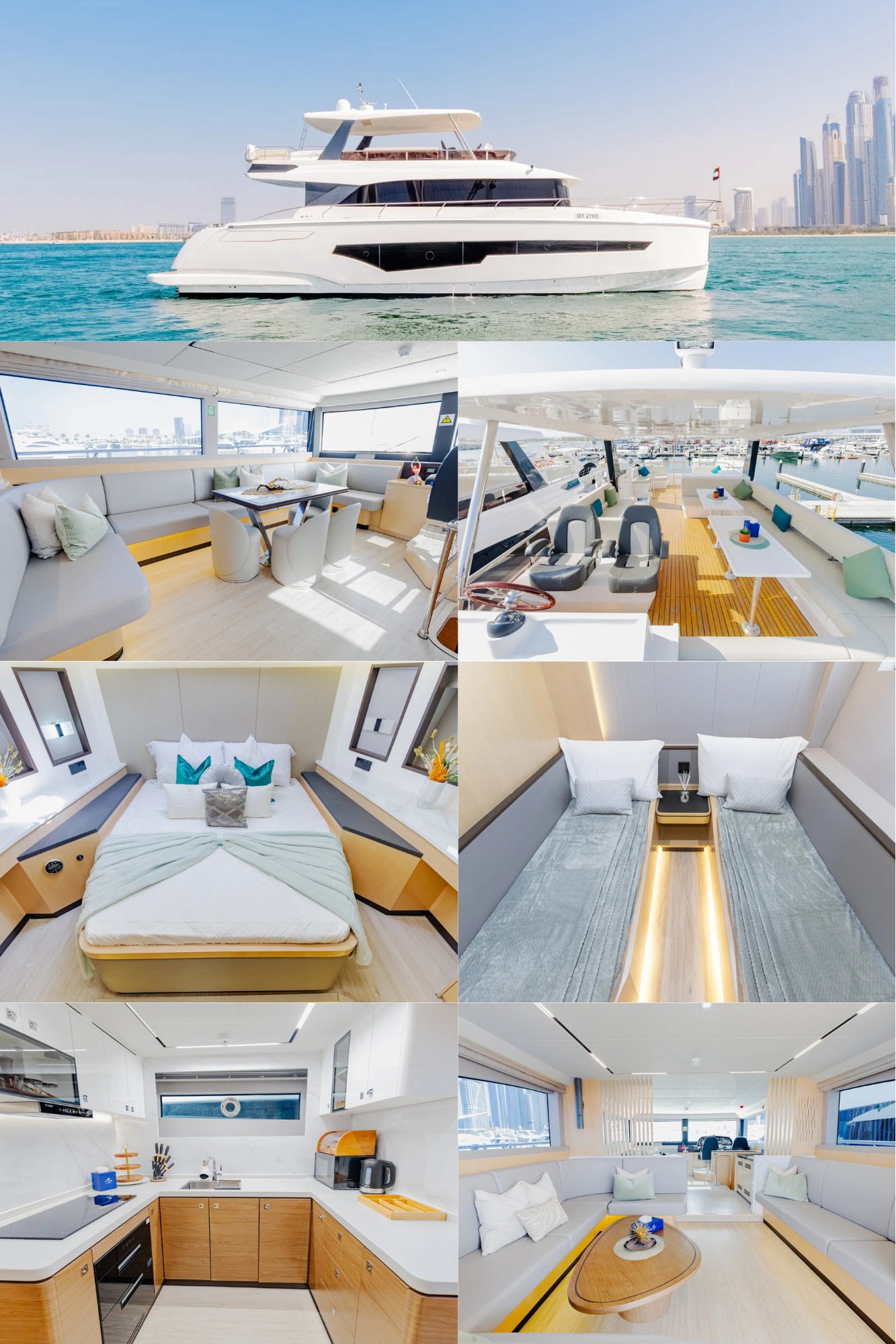 This stylishly built yacht can accommodate 15 guests at a time in its dining space both indoor and on the flybridge. It can also accommodate 6 guests overnight. There is 1 Master cabin, 1 Double cabin, and 1 twin cabin. The crew onboard ensures your comfort and takes care of all your needs, including cleaning, meals, and any help.